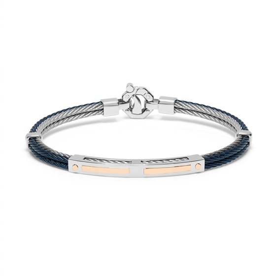 Bracciale semirigido da uomo. Colore: blu, oro rosa e argento. Il gioiello è in acciaio inossidabile 316L realizzato con finitura in pvd blu composto da multi bracciali e targhetta centrale con dettaglio in oro rosa 750‰ (18kt). La chiusura a moschettone è impreziosita con un diamante naturale di caratura 0,02. I gioielli Barakà sono realizzati artigianalmente da maestri orafi italiani per l’uomo che ama il lusso.