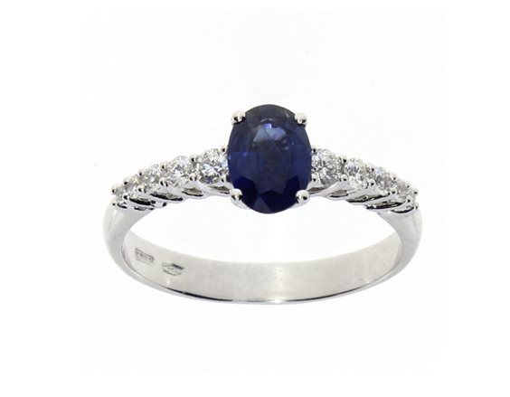Anello in oro bianco con zaffiro (0.9ct) e diamanti (0.25ct colore GH).