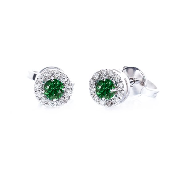 Paio di orecchini in oro bianco 18 KT con 2 smeraldi naturali a taglio rotondo da 0.09 ct e 24 diamanti bianchi qualità