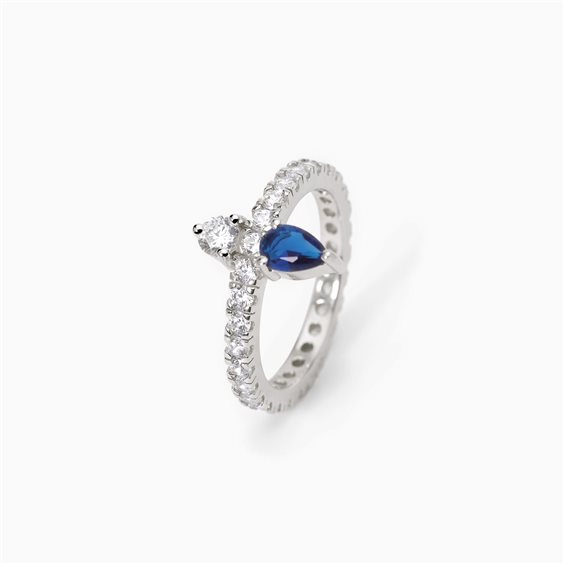 Anello in argento 925/°°° rodiato con zaffiro sintetico taglio goccia 6x4 mm e zirconi bianchi Ø 3.5 e 2 mm, misura 11