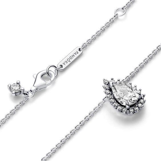 Collana Punto Luce Goccia Argento Sterling 925; 1 zirconia cubica incolore con incastonatura a griffe e taglio a pera sfaccettato e 1 zirconia cubica incolore con incastonatura a griffe e taglio brillante rotondo; 19 zirconia cubica incolore con lavorazione a pavè e taglio brillan