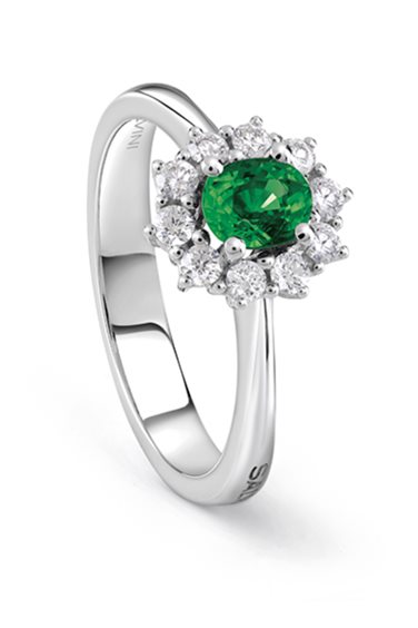 Anello della collezione Love for color in oro bianco con smeraldo a taglio ovale di caratura 0.36 e diamanti a taglio rotondo di caratura 0.25 di colore G.