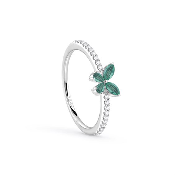 Anello con farfalla della collezione Libera in oro bianco con smeraldo di caratura 0,28 e diamanti a taglio rotondo di caratura 0,11 di colore GH.