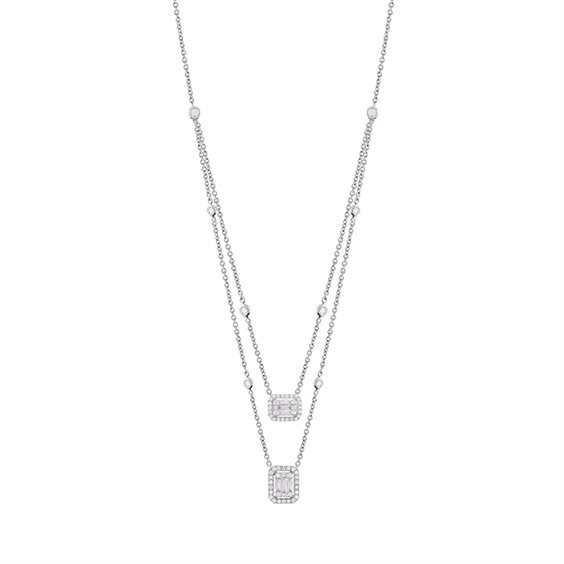 Collana della collezione Magia in oro bianco con diamanti centrali a taglio baguette di caratura 0,18 di colore G e diamanti nel contorno di taglio rotondo di caratura 0.30 di colore GH.