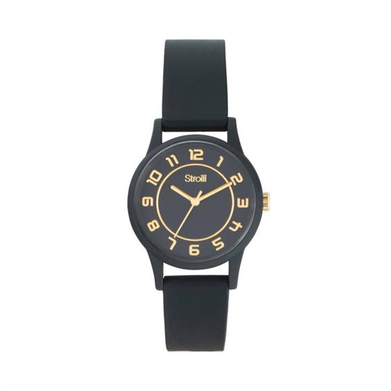 Orologio Donna Stroili collezione Marsiglia, Analogico Solo Tempo movimento al Quarzo, Cassa (diam. 32 mm) Soft Touch in Policarbonato Colore Nero. Cinturino in Silicone Soft Touch Nero, Quadrante Nero con Indici a Bastoni e Lancette Colore Gold. Resistenza all’Acqua fino a 5 ATM.