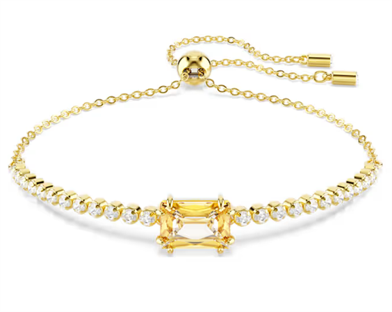 Questo classico bracciale tennis aggiunge un tocco di radiosità a ogni look. Dotato di una chiusura scorrevole per una vestibilità regolabile, il design placcato in tonalità oro presenta una fila uniforme di Swarovski Zirconia ed è impreziosito da una Swarovski Zirconia taglio Baguette color caramello al centro. Una vivace interpretazione di uno stile intramontabile, da indossare ad ogni occasione.