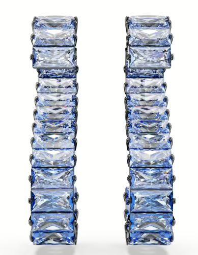 Orecchini da donna di Swarovski della collezione matrix. Orecchini Placcato rutenio con cristalli Swarovski taglio baguette. Dimensione: 3.5 x 0.7 cm. Colorazione del cristallo blu. Chiusura farfallina. La referenza è 5705780