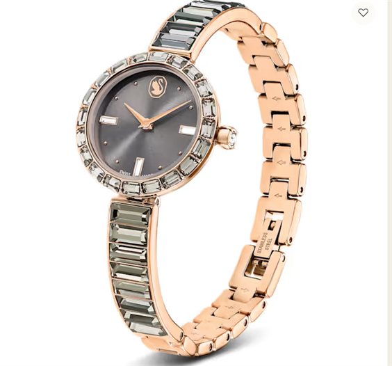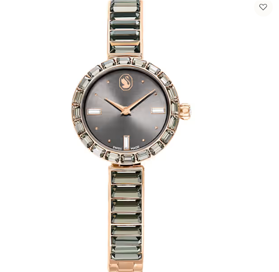 L’eleganza è amplificata dai cristalli in questo splendido segnatempo ispirato ai gioielli. Il design in acciaio inossidabile da 25 mm ha una finitura color oro rosa ed è circondato da una lunetta con 20 cristalli grigio scuro taglio Baguette, mentre un unico cristallo è montato nella corona. Cristalli taglio Baguette impreziosiscono inoltre tre indici sul quadrante grigio scuro, che presenta anche un logo cigno a ore 12. Attorno al polso, il bracciale in stile bangle è impreziosito da 16 cristalli taglio Baguette ed è completamente regolabile per una comoda vestibilità. L’orologio Swiss Made è resistente all’acqua fino a 50 m ed è l’accessorio ideale per illuminare ogni sfaccettatura della tua vita. Articolo nr.: 5679887 Collezione: Matrix Bangle Dimensioni della cassa: 25 mm x 25 mm Lunghezza del cinturino dell'orologio: 165 cm Materiale: Cristalli, PVD oro rosa Colore: Grigio Tipo di fermaglio: Fermaglio ripiegabile su se stesso Materiale del cinturino: Cristalli Prodotto in: Svizzera Meccanismo dell'orologio: Quarzo