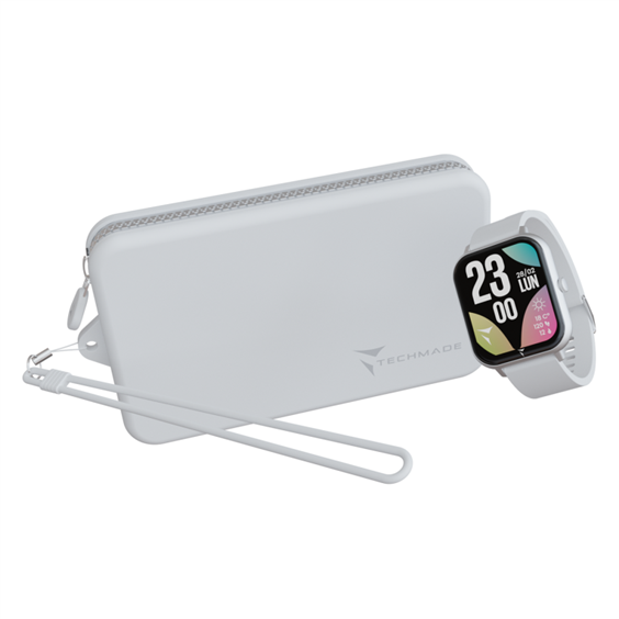 Smartwatch di Techmade unisex della collezione Glow. Schermo ampio rettangolare e full touch di dimensione pari a: 40x50x11 mm. Diverse funzioni disponibili: chiamata, notifiche, sos, cardio test (freq. cardiaca, pressione e saturazione), pedometro, calorie, distanza, assistente vocale, cronometro, sleep monitor, wrist sense, sport, resoconto mestruale, sfondo personalizzabile ecc. Compatibile con IOS 9 o superiori e android 4.4 o superiori. Smartwatch Waterproof IP67 con borsetta abbinata