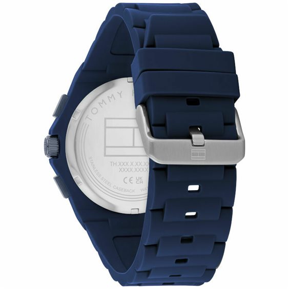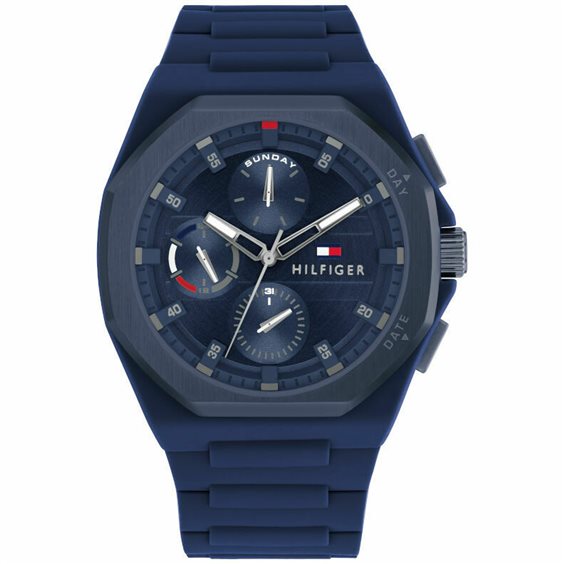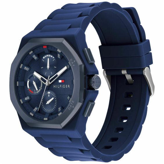 Orologio uomo realizzato con cassa in acciaio blu dal diametro di 44 mm, cinturino in silicone blu. Quadrante blu con indicazione del giorno, data e 24H. L'impermeabilità è garantita a 5BAR.